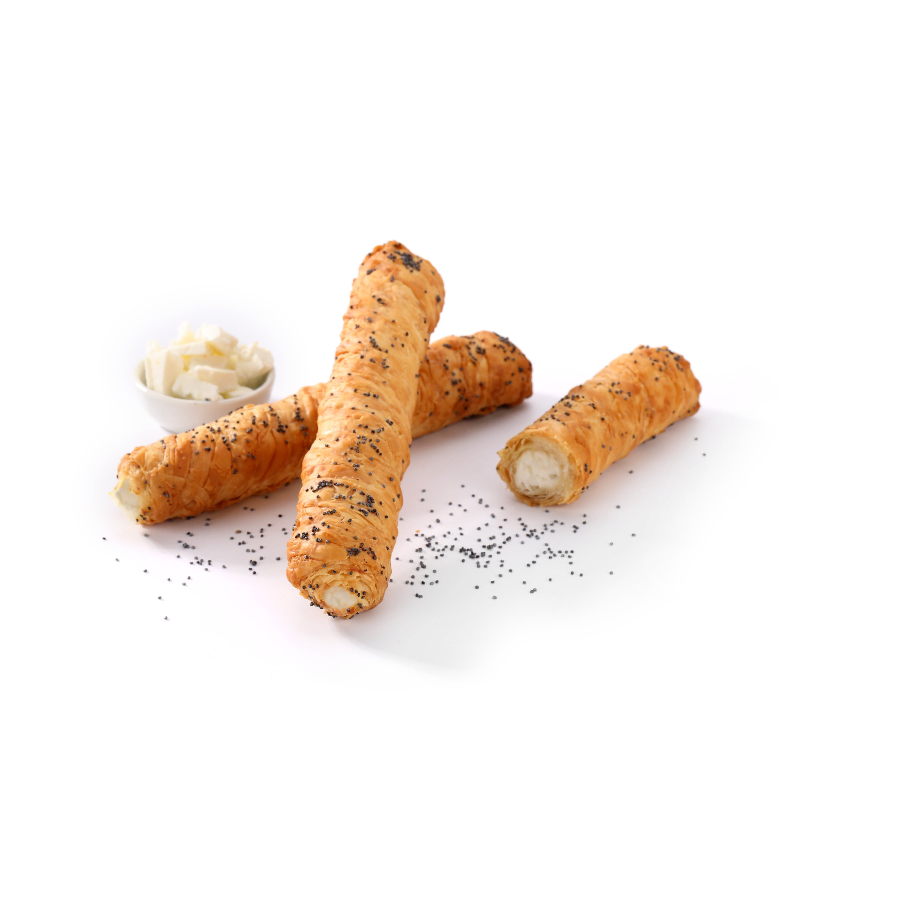 PŠENIČNÁ mouka, sýrová náplň (30%) (pitná voda, ricotta (30%) (syrovátka ((MLÉKO) (kráva, ovce, koza)), syrovátková smetana (MLÉKO), smetana (MLÉKO), regulátory kyselosti (kyselina mléčná, kyselina citronová)), mozzarella sýr (15%) (MLÉKO, jedlá sůl, regulátor kyselosti (kyselina citronová), syřidlo, mléčné kultury), sýr feta (11,5%) (ovčí MLÉKO, kozí MLÉKO, mléčné kultury, syřidlo, jedlá sůl), slunečnicový olej, modifikovaný škrob, sušený VAJEČNÝ bílek, jedlá sůl s jódem (jedlá sůl, jodičnan draselný)), slunečnicový olej, pitná voda, kukuřičný škrob, mák, jedlá sůl s jódem (jedlá sůl, jodičnan draselný), cukr, droždí.