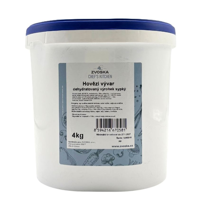 Jedlá sůl (40%), maltodextrin, látka zvýrazňující chuť-glutaman sodný, kvasničný extrakt, sušený rostlinný tuk (palmový), cukr, SYROVÁTKA sladká, sušená zelenina 7,2% (cibule, karotka, CELER kořen, petržel list), aroma-hovězí, sušená SOJOVÁ omáčka, barvivo-karamel, kurkuma, hovězí extrakt 0,2%
