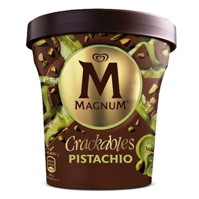 guma tara, karagenan), PISTÁCIE (0,4 %), modifikovaný škrob, emulgátory (E471, E322), karamelový sirup, jedlá sůl, barviva (E141, E160a), kakao se