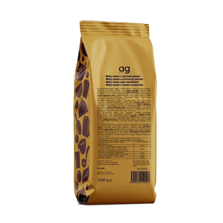 AG PRO Milky shake s příchutí jahoda je nealkoholický nápoj v prášku, s příchutí jahoda, určený pro přípravu koktejlů v nápojových automatech. Dávkování: 19 g na 150 ml nápoje.