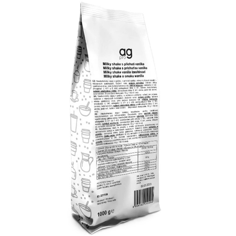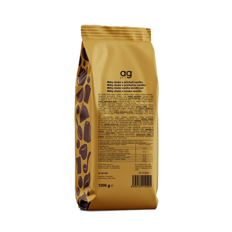AG PRO Milky shake s příchutí vanilka je nealkoholický nápoj v prášku, s příchutí jahoda, určený pro přípravu koktejlů v nápojových automatech. Dávkování: 19 g na 150 ml nápoje.