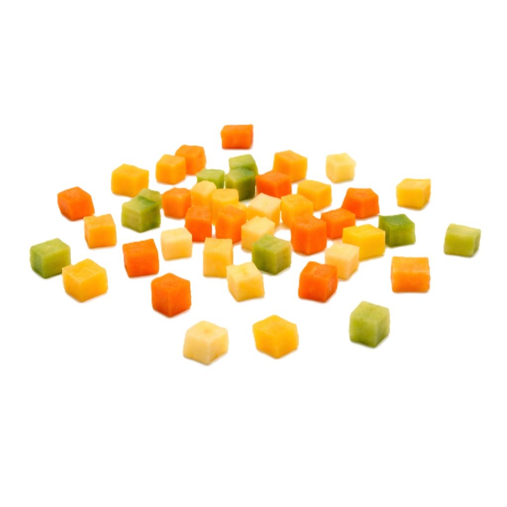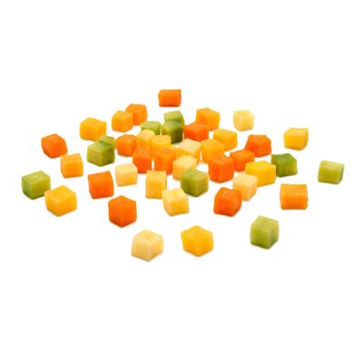 Barevná zeleninová směs je ideální jako příloha k bulguru, rýži či těstovinám, do polévek, omáček i salátů, nebo orestovaná na másle jako efektní ozdoba při servírování masa. Díky jemné struktuře ji ocení i děti a její syté barvy zůstávají dlouho zachované – fantazii v kuchyni se meze nekladou. Kostičky 4x4mm.