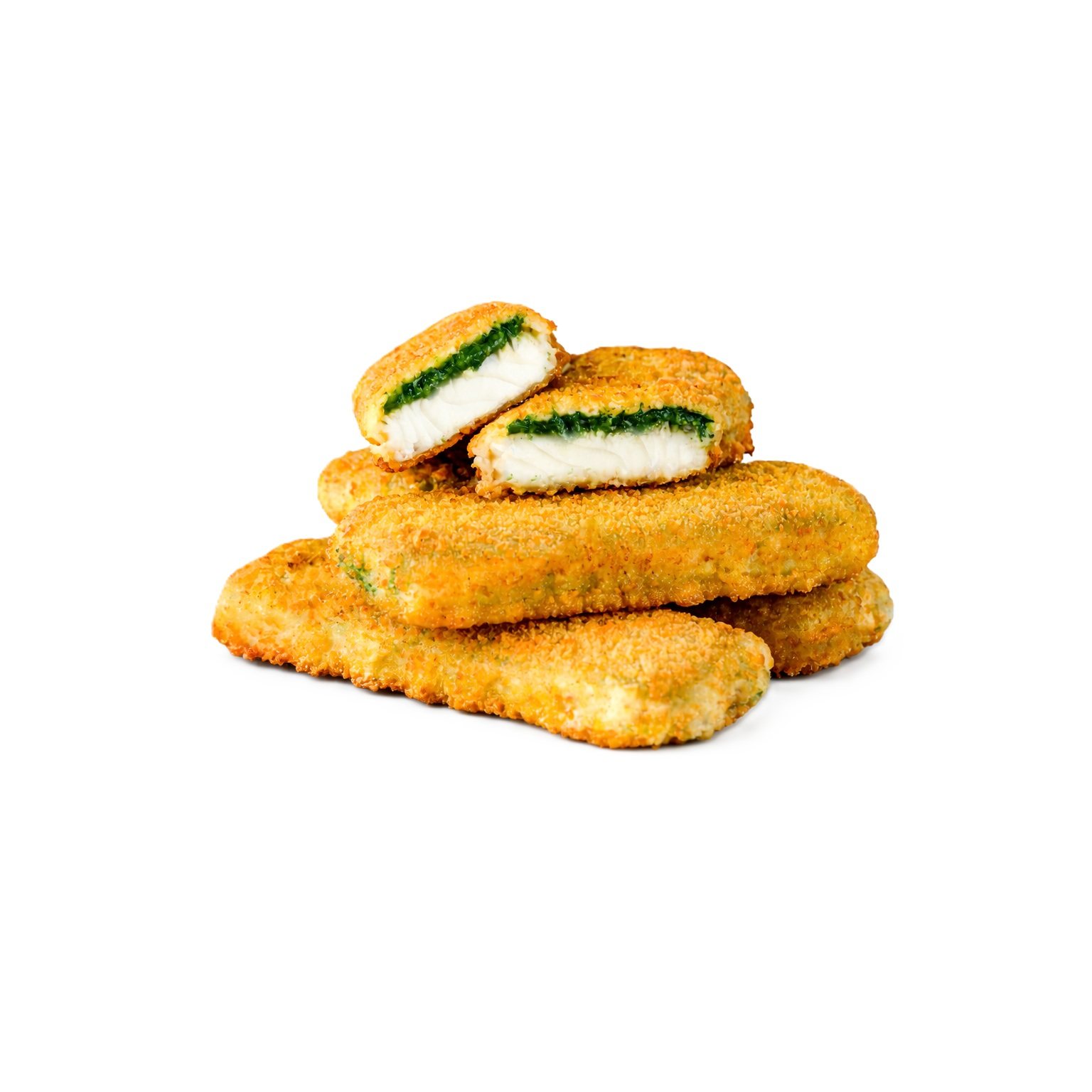 Rybí filé 44%, pšeničná mouka, špenátová omáčka 17% (špenát 9%, voda, modifikované škroby, sýr, jedlá sůl, sušené mléko, koření, cukr), rostlinné oleje (řepkový, slunečnicový), voda, bramborový škrob, jedlá sůl, glukóza, kvasnice, koření