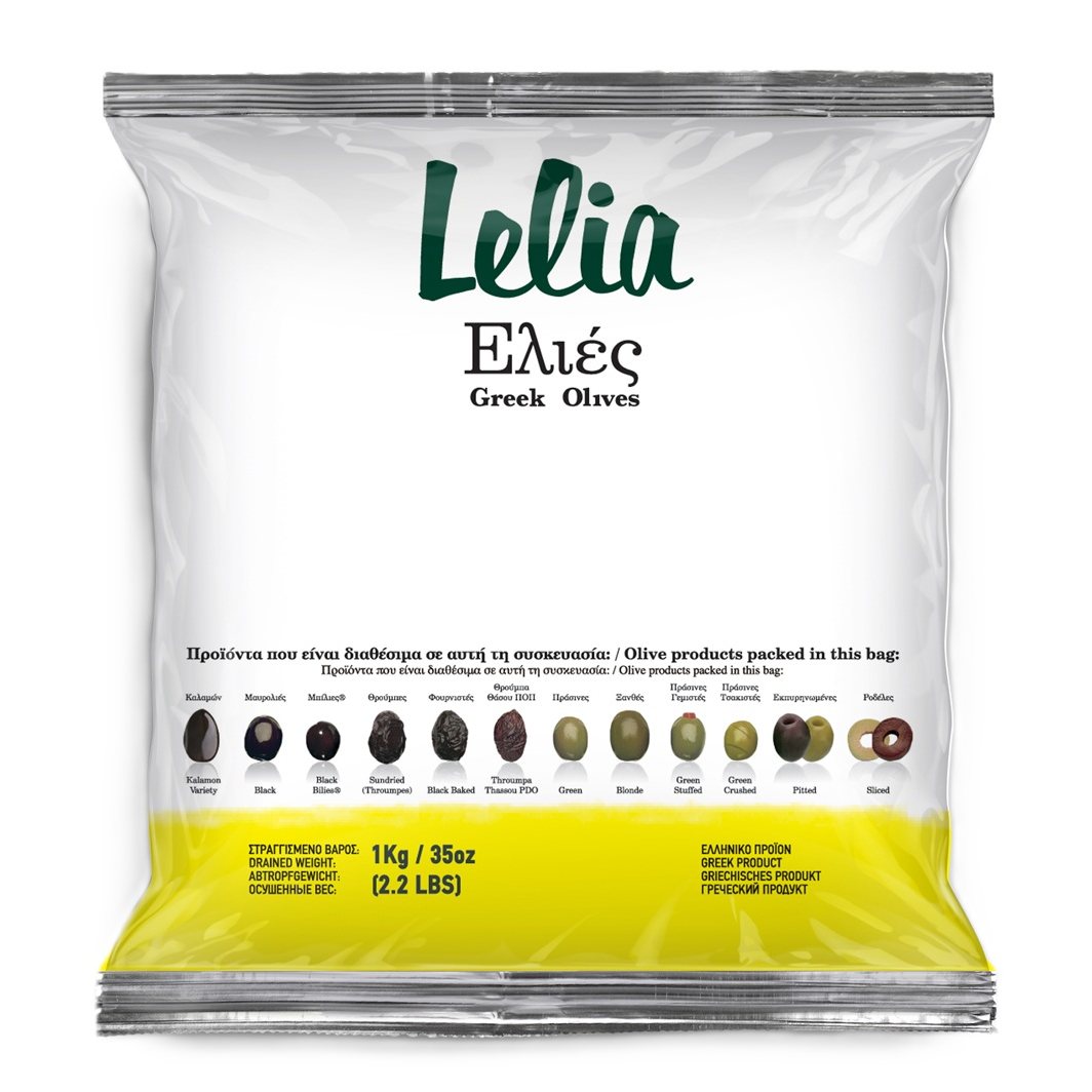 Vypeckované černé olivy uskladněné v sáčku. Baleno v ochranné atmosféře. Olivy pochází z poloostrova Peloponés z oblasti Kalamata.