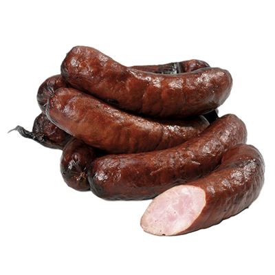 Vepřové maso 65 %, pitná voda, hovězí maso 8 %, bramborová škrob 2 % , dusitanová solicí směs(jedlá sůl, jodičnan draselný, konzervant E 250) přírodní koření, stabilizátory, E 451, E 452, extrakty koření, živočišná bílkovina(vepřová), antioxidant E316, látka zvýrazňující chuť a vůni. E 621, barvivo E 120, pokryv hemoglobin, karamelizovaný cukr, barviva: červená řepa, E 153, vepřový protein, glukózový sirup, antioxidant E 301, kouřové aroma. Jedlé střívko.