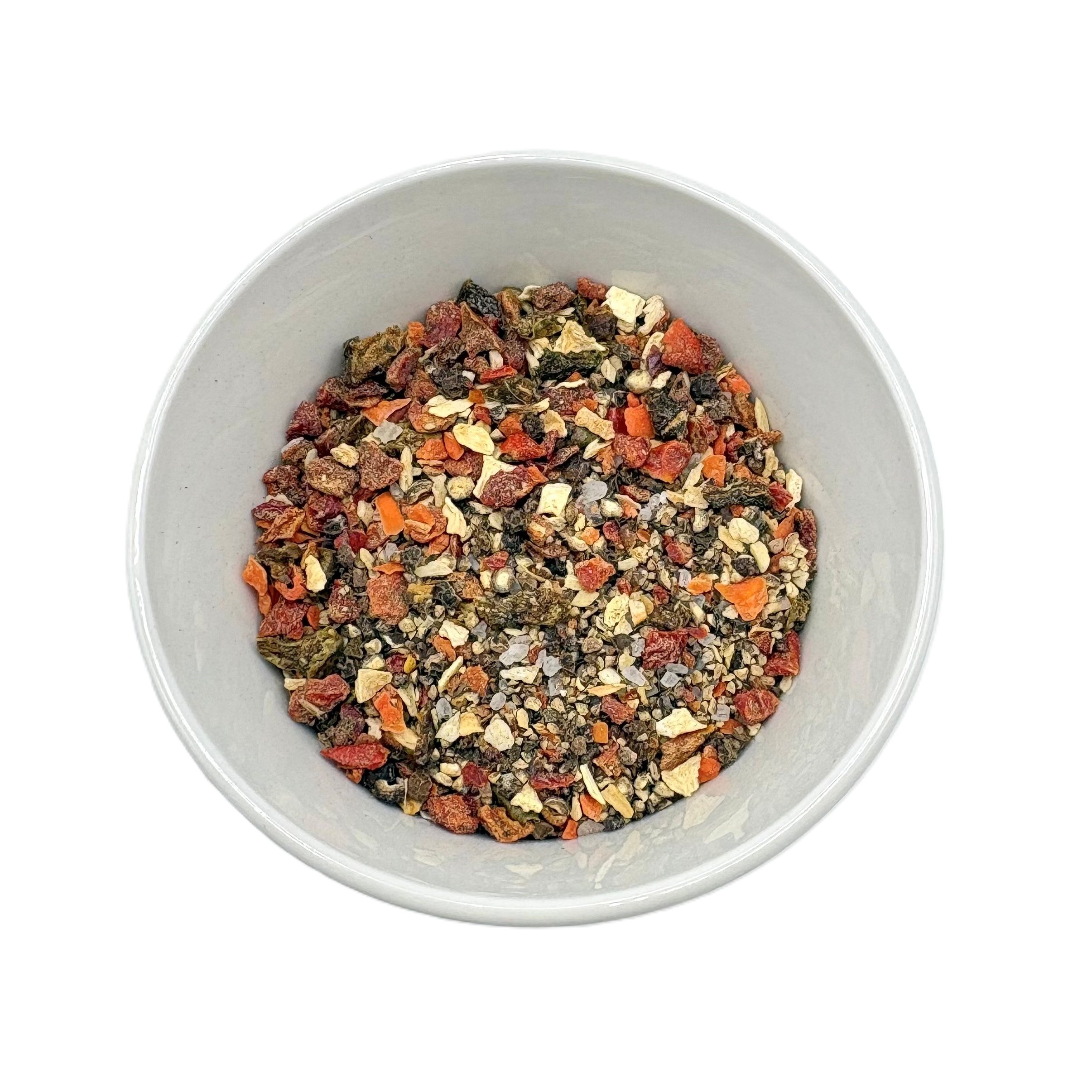 Pepř černý drcený, paprikové floky, sůl (10%), cibule, karotka,petržel kořen, pastiňák kořen.