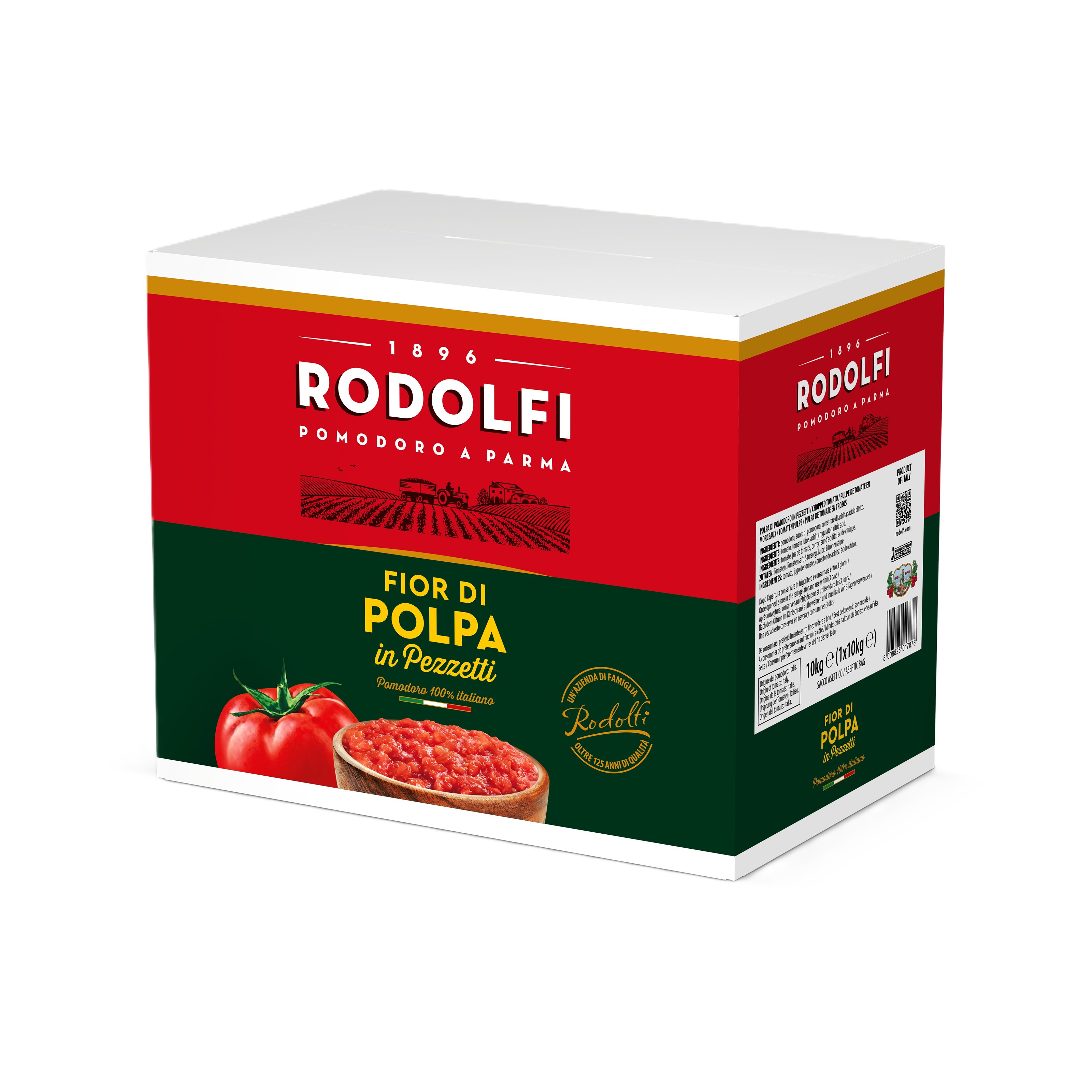 Rajčatová polpa s kousky rajčat ve velkém bag-in-box balení, vhodná jako kvalitní základ pro vaření omáček a dalších rajčatových receptů.