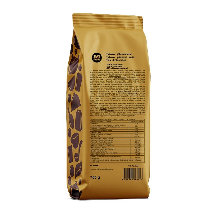 instantní rýžová mouka 43 %, instantní jáhlová mouka 21 %, fruktóza, náhrada mléka (glukózový sirup, plně ztužený kokosový tuk, emulgátory: E 471, E 472e, mléčná bílkovina, stabilizátory: E 340, E331, E 452, protispékavá látka: E 551, aroma), sušená syrovátka, vláknina inulin 6 %, směs vitaminů (E, C, thiamin, riboflavin, niacin, B6, kyselina listová, B12, biotin, kyselina pantothenová), aroma
